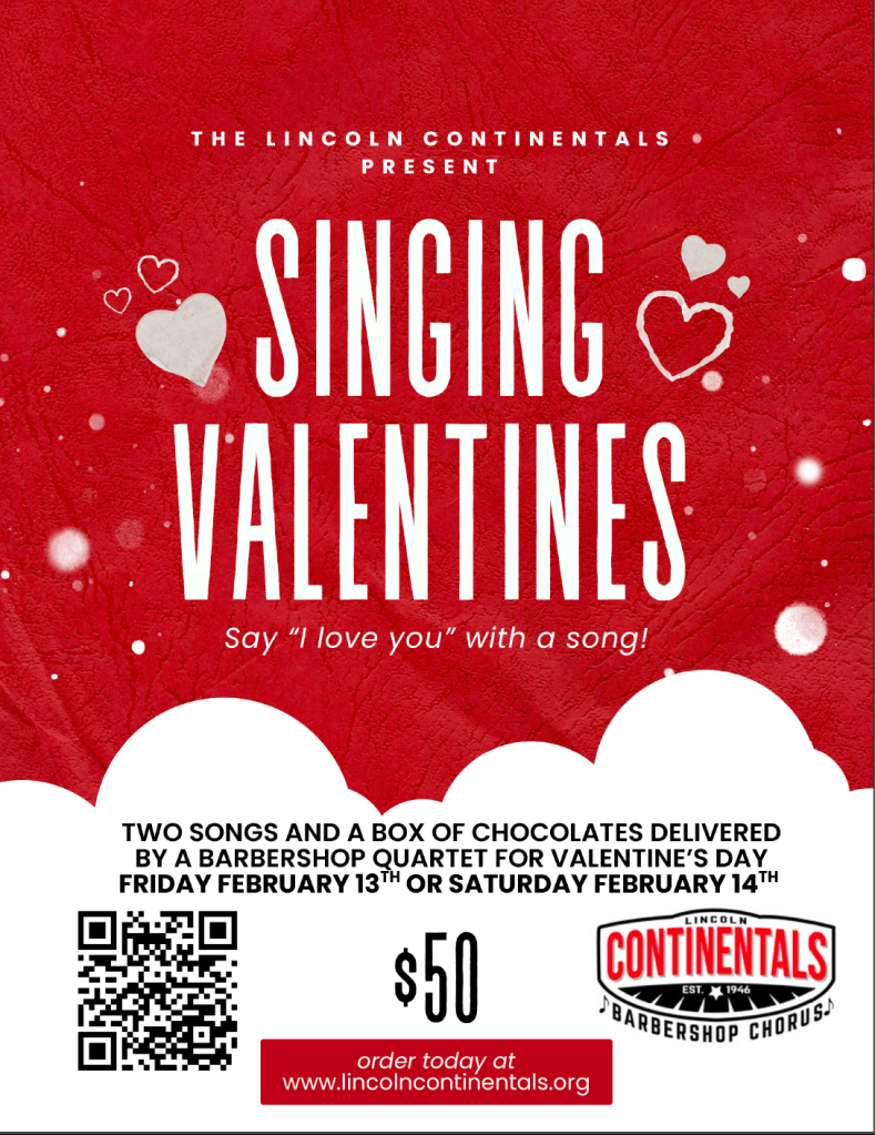 Order a Singing Valentine delivered on Friday (2/13) or Saturday (2/14) by one of our quartets for $50.