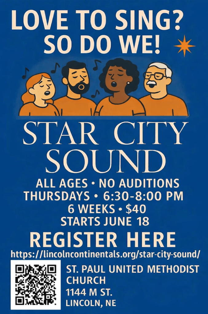 The Star City Sound starts our third year on Thursday, June 18 at 6:30 at St. Paul United Methodist Church, 1144 M St, Lincoln, NE.